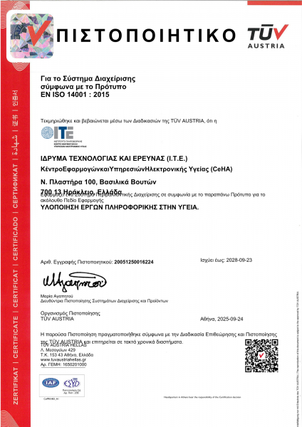 Με την ανάπτυξη του συστήματος περιβαλλοντικής διαχείρισης κατά ISO 14001:2015, το Κέντρο Εφαρμογών και Υπηρεσιών Ηλεκτρονικής Υγείας (CeHA) αναγνωρίζει τις ευθύνες και τις υποχρεώσεις της απέναντι στο περιβάλλον και στον άνθρωπο και δεσμεύεται για: